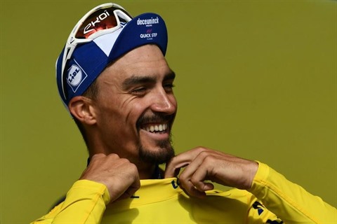 | Le Français Julian Alaphilippe conserve le maillot jaune du Tour de France à l'arrivée de la 12e étape, le 18 juillet à Bagnères-de-Bigorre |