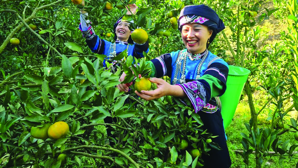 | Jardin de mandarines de Lò Din Phung (droite), une femme d’ethnie Bô Y, du village de Lao Chai, bourg de Muong Khuong, province montagneuse de Lào Cai (Nord). |