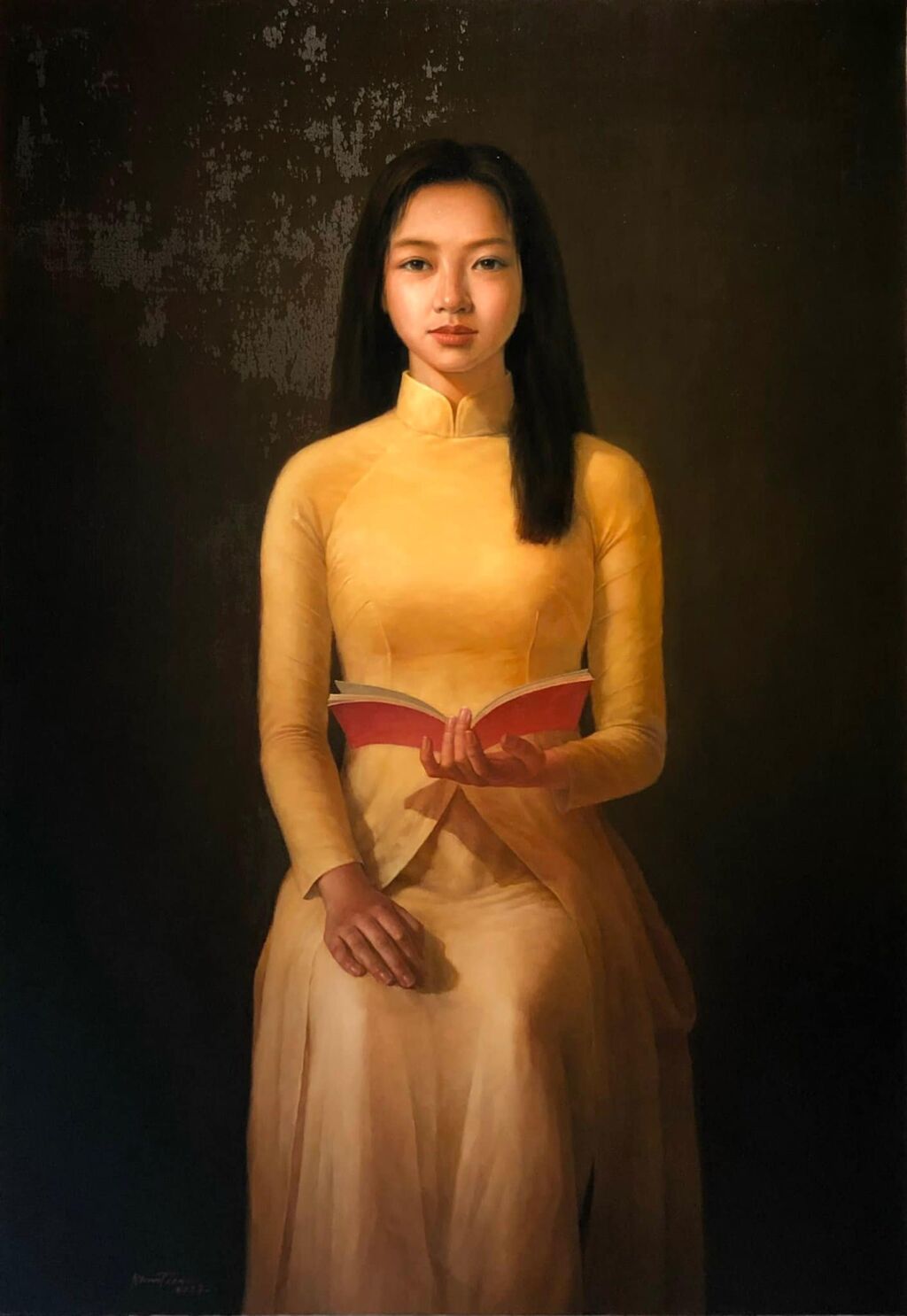 L’artiste Cao Nam Tiên a partagé qu’actuellement, il voit rarement des gens lire des livres. Il a donc représenté une jeune femme vêtue d’une longue robe tenant un livre à la main, mais il semble sur le point de s’envoler. Il a nommé cette œuvre Sach do (Livre Rouge) pour la couleur de sa couverture tenue par la jeune femme. Nam Tiên a utilisé la peinture à l’huile en plusieurs couches avec une méthode méticuleuse pour donner vie à l’image.