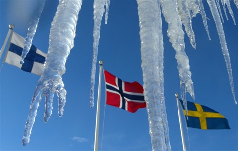 | Le drapeau de la Finlande (g), aux côtés de ceux de ses voisins scandinaves, la Norvège (c) et la Suède. |