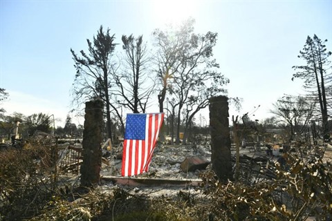 | Un drapeau américain flotte sur les ruines d'une maison dévorée par les flammes à Santa Rosa, en Californie, le 12 octobre. |