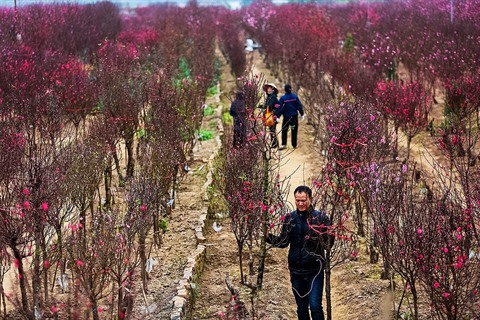 Alors que le Têt du Chien approche à grand pas, les gens affluent vers les vergers de Nhât Tân pour acheter, louer, ou simplement admirer les pêchers et prendre des photos souvenirs.