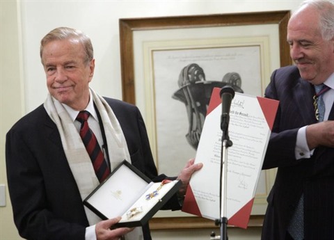 | (ARCHIVES) Le réalisateur italien Franco Zeffirelli (gauche) montre la médaille de chevalier qu'il a reçue de l'ambassadeur britannique en Italie, Sir Ivor Roberts, durant une cérémonie à l'ambassade de Grande-Bretagne à Rome, le 24 novembre 2004. |