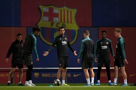 | Le milieu de terrain espagnol du FC Barcelone, Sergio Busquets, parlent avec des coéquipiers lors d'un entraînement le 4 novembre 2019. |