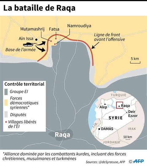 Les combats en Syrie semblent se concentrer contre l'EI dans la province de Raqa (Nord-Est), dont le chef-lieu éponyme est considéré comme la capitale de facto du "califat" auto-proclamé de l'EI.