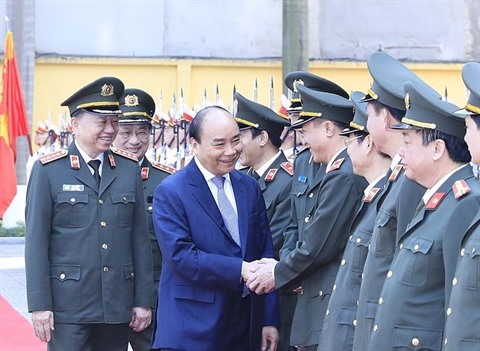 | Le Premier ministre Nguyên Xuân Phuc (premier à gauche) et des représentants des forces de la Garde de la Police populaire, le 11 janvier à Hanoï. |