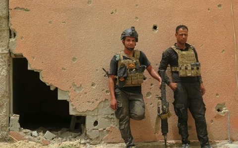 | Des membres des forces antiterroristes devant un bâtiment endommagé à Fallouja lors d'une opération pour reprendre la ville au groupe EI le 16 juin |