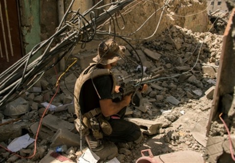 | Un membre des forces d'élite du contre-terrorisme dans la vieille ville de Mossoul le 5 juillet. |
