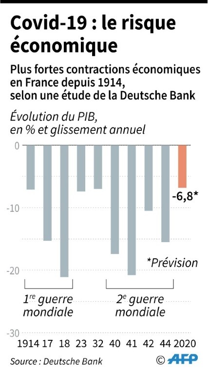 Le ministre de l'Économie, Bruno Le Maire, a brossé le scénario d'une économie frappée de plein fouet, avec une récession "vraisemblablement très au-delà des -2,2%", soit le "plus mauvais" chiffre depuis la fin de la Seconde guerre mondiale, avec un pays en ruines. "C'est dire l'ampleur du choc économique auquel nous sommes confrontés", a-t-il insisté.