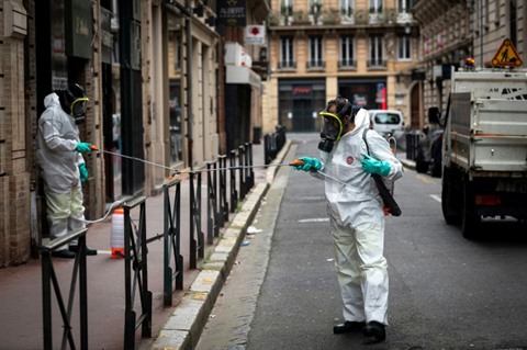 | Des agents municipaux à Toulouse désinfectent les rues, le 6 avril. |