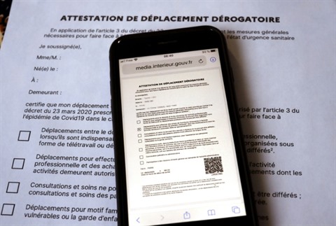 | La version numérique de la nouvelle attestation de déplacement dérogatoire visible sur un smartphone, le 6 avril à Paris. |