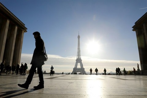 | Des promeneurs sur le Parvis des droits de l'Homme, en face de la Tour Eiffel, le 14 novembre à Paris. |
