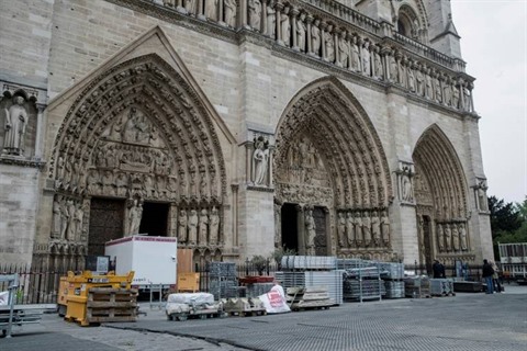 | Du matériel de construction devant Notre-Dame de Paris le 2 mai. |