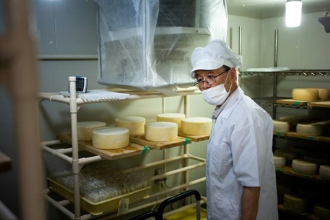 | Le Japonais Kazuhiko Ochiai devant les fromages qu'il produit, le 25 juillet à Nasushiobara, au nord de Tokyo |