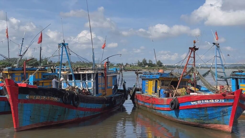 | Des bateaux de pêche accostent dans un estuaire, à Quang Ngai. |