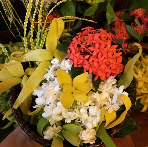 Les ngoc lan (Magnolia × alba), hoa ngâu (Aglaia odorata), hoàng lan (ylang-ylang), lotus, jasmin, et autres jeunes fleurs de palmier à bétel, sont placées par les mains habiles de Nha Thanh sur le panier plat en bambou de manière esthétique et créative.