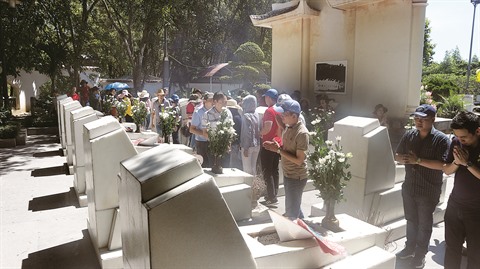 | Des visiteurs se recueillent devant les tombes des dix jeunes femmes volontaires. |