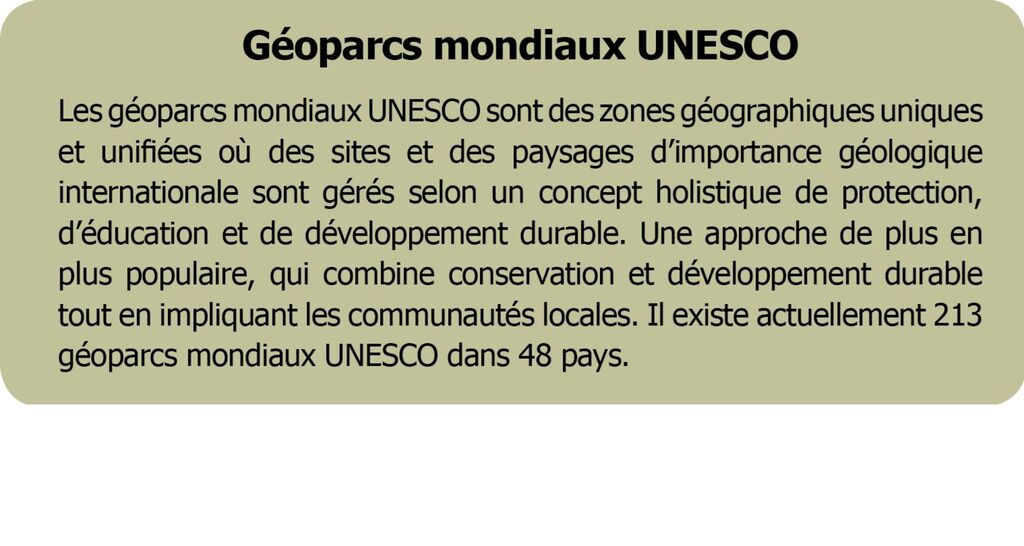 Les géoparcs mondiaux sont devenus un outil de plus en plus important permettant à l’UNESCO d’impliquer les États membres et leurs communautés dans les sciences de la Terre et la préservation des géopatrimoines.