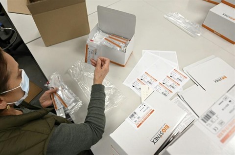 | Un employé assemble des kits d'autotests antigènes rapides pour détecter le COVID-19 au sein de la société Biosynex, à Illkirch-Graffenstaden, dans l'Est de la France, le 29 décembre. |