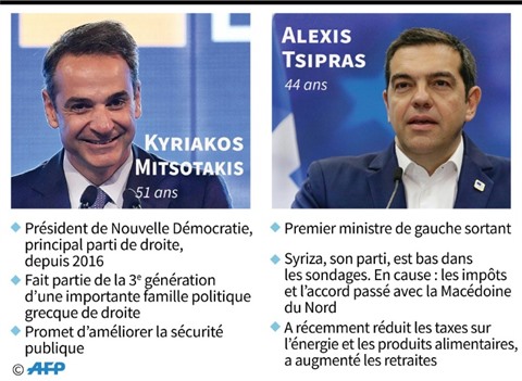 Trois ans après avoir pris les rênes du parti conservateur, Kyriakos Mitsotakis, perçu comme un réformateur, proche des milieux d'affaires, a promis de "relancer l'économie" et de "laisser la crise derrière nous". L'élection de ce fils d'ancien Premier ministre, descendant d'une grande dynastie politique, signerait le retour de la "familiocratie" au gouvernement grec, une tradition qu'Alexis Tsipras avait interrompue en accédant au pouvoir à l'âge de 40 ans.