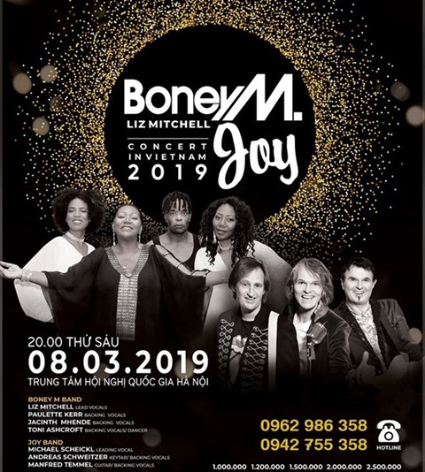 Le concert Boney M et Joy, qui fait partie du série Legend Concert, offrira aux fans locaux une soirée musicale avec les célèbres mélodies des deux groupes. Les billets sont déjà en vente à des prix allant d’un à quatre millions de dongs (soit de 43 à 172 USD).
