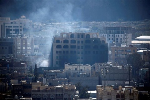 | De la fumée s'échappe d'un bâtiment de la capitale yéménite Sanaa, le 3 décembre. |