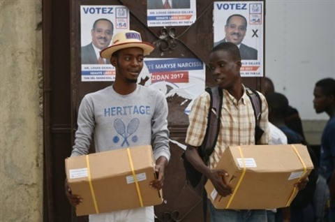 | Des jeunes Haïtiens amènent des fournitures dans un bureau de vote du centre de Port-au-Prince pour les élections de dimanche, le 19 novembre 2016. |
