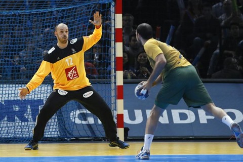 | Un arrêt du gardien des Bleus, Thierry Omeyer, face au Brésil, le 11 janvier à Paris. |