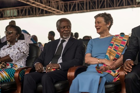 | Kofi Annan et sa femme Nane Marie (droite) assistent à l'investiture du président ghanéen Nana Akufo-Addo, à Accra, au Ghana, le 7 janvier 2017. |