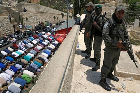 | Des forces de sécurité israéliennes en faction le 20 juillet près de la Porte des Lions, où prient des Palestiniens protestant contre les nouvelles mesures de sécurité à la mosquée Al-Aqsa. |
