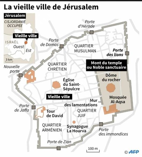 L'esplanade des mosquées, où se trouvent le dôme du Rocher et la mosquée al-Aqsa, est située dans le Vieux Jérusalem, secteur palestinien de la ville sainte dont l'annexion par Israël n'a jamais été reconnue par la communauté internationale.