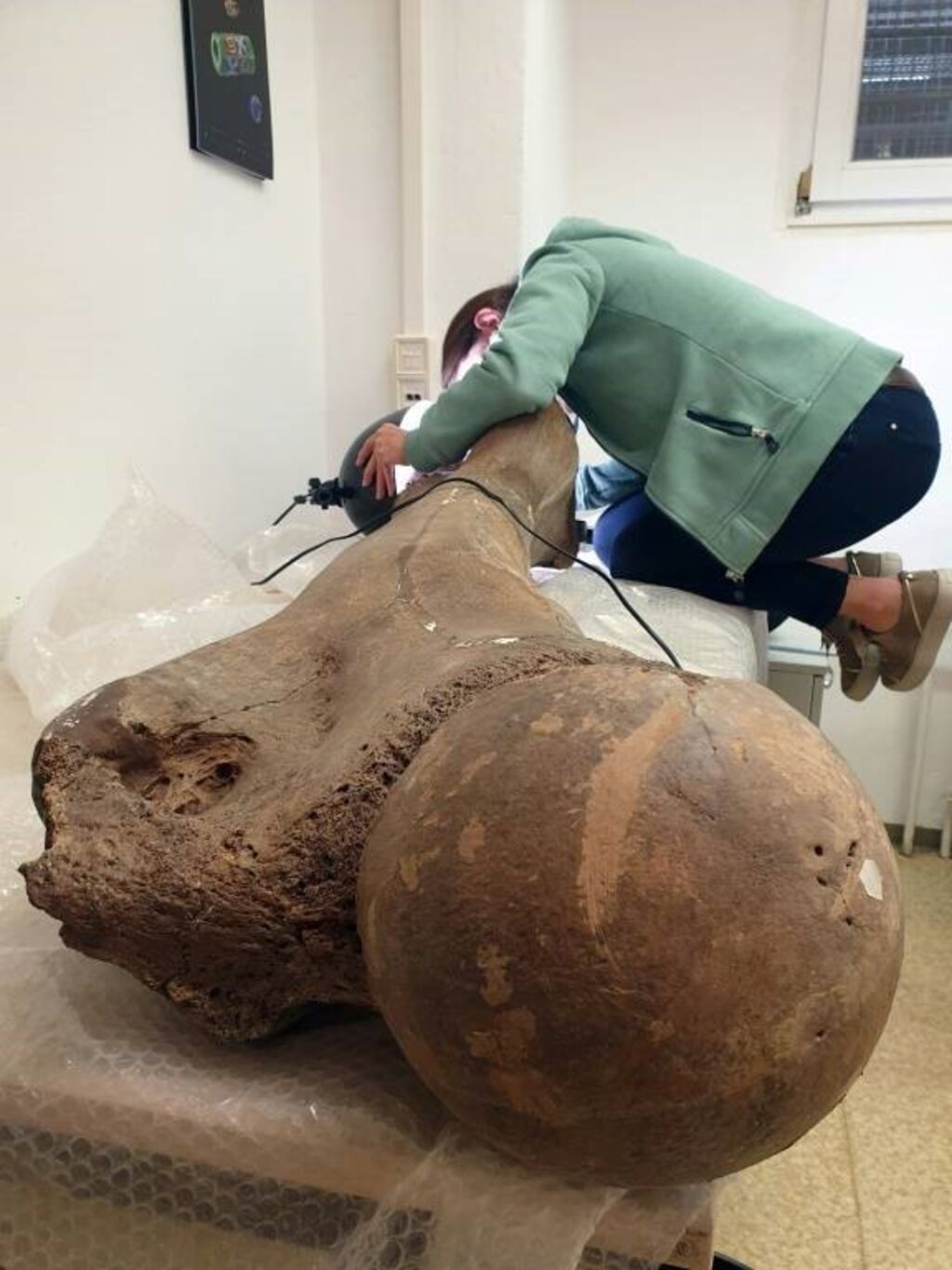 | La chercheuse Sabine Gaudzinski-Windheuser examine un os d'éléphant adulte à la recherche de marques laissées par des outils de Néandertaliens. Photo : AFP/VNA/CVN |