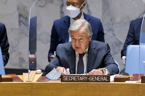 | Le secrétaire général de l'ONU, Antonio Guterres, à la réunion d'urgence du Conseil de sécurité de l'ONU sur la situation en Afghanistan à New York (États-Unis), le 16 août. |