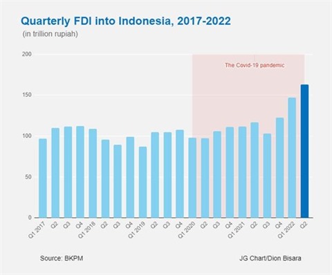 Singapour, la Chine et le Japon ont été les principales sources d'investissement étranger de l'Indonésie pour la période. La hausse de 39,7% a été la plus forte augmentation de tous les trimestres depuis 2011, selon les dossiers d'Eikon Refinitiv.