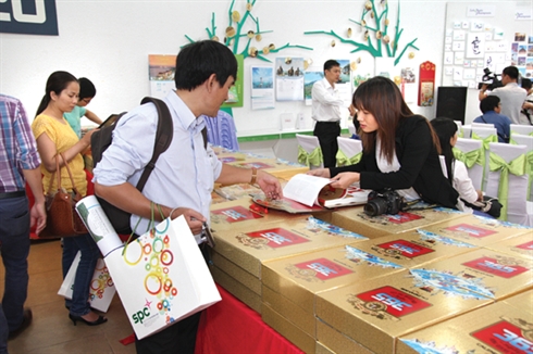 | Le thème sur la mer et les îles sur les calendriers de 2015 attire l'attention des visiteurs lors de la l’exposition «Semaine du livre et du calendrier du Vietnam» |