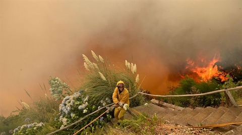| Un pompier lutte contre le feu de forêt, le 9 août à Funchal sur l'île portugaise de Madère. |