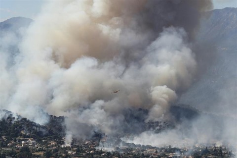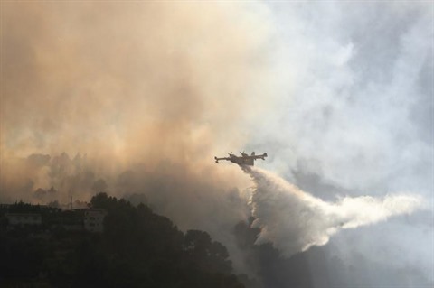 | Un Canadair largue sa cargaison d'eau dans les environs de Carros dans les Alpes-Maritime le 24 juillet. |