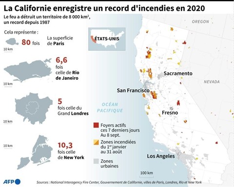 | Les incendies en Californie ont brûlé 800.000 hectares (8.000 km²) en 2020 |