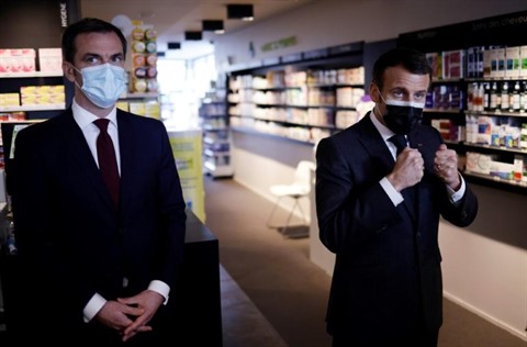 | Emmanuel Macron et le ministre de la Santé Olivier Véran, dans une pharmacie à Valenciennes, le 23 mars. |