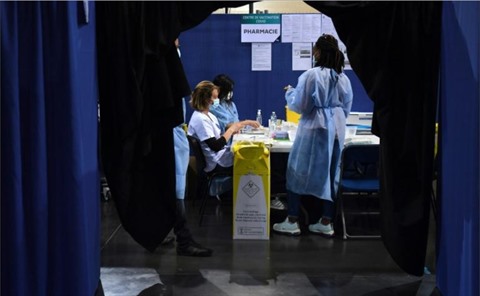 | Dans le centre de vaccination du vélodrome de Saint-Quentin-en-Yvelines, le 23 mars. |