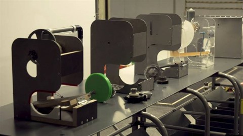 Surmontées de grandes bobines de fil plastique, les imprimantes font chauffer une tête à 85°C qui fera fondre ce matériau pour que des bras articulés mécaniques, rapides et précis, le disposent ensuite sur une plaque de verre où, peu à peu, les visières prennent forme.