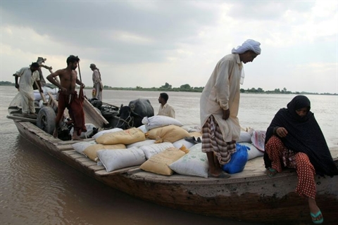 | Des villageois pakistanais arrivent sur la terre ferme après s'être déplacés avec un bateau pendant plusieurs jours, le 28 juillet, près de Multan dans le Sud du Pakistan. |