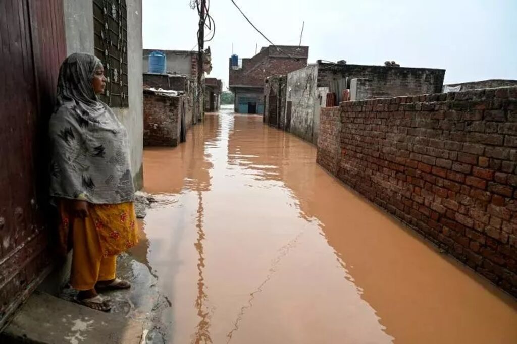 | Ghulam Bano près de sa maison submergée par les eaux en crue du fleuve Ravi à Shahdara, le 29 août au Pakistan. |