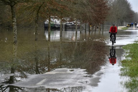 | Un homme fait du vélo sur une route inondée le 29 janvier le long des rives inondées de la Saône entre Tournus et Macon. |