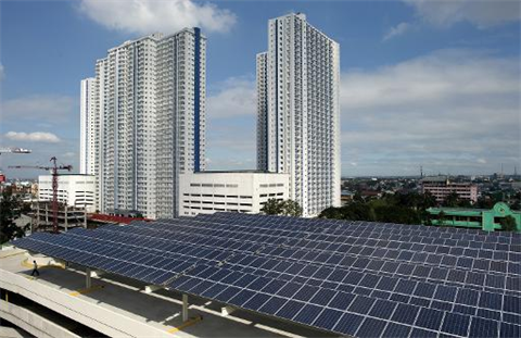 | Des panneaux solaires aux abords du centre commercial SM City de Manille. |
