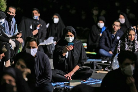 | Des Iraniens portant des masques sanitaires prient pendant la "Nuit du Destin", à Téhéran, le 13 mai. |
