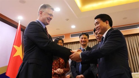 | Le président du Comité populaire de Hanoï, Nguyên Duc Chung (droite), et l'ambassadeur des États-Unis au Vietnam, Daniel Kritenbrink. |