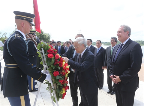 | Le secrétaire général du PCV, Nguyên Phu Trong (centre), pose une gerbe de fleurs à la maison du souvenir du président Thomas Jefferson, le 6 juillet à Washington. |