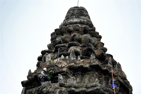 | Un jardinier enlève des pousses d'arbre sur le temple d'Angkor Wat, le 12 octobre. |