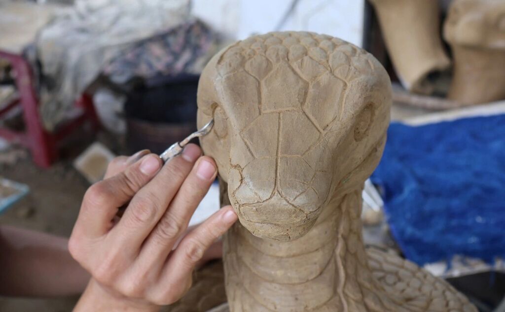 La partie la plus délicate du travail réside dans le façonnage du corps du serpent, qui doit être courbé de manière fluide tout en maintenant une posture droite et stable. Chaque figurine mesure 50 cm de haut, 40 cm de large et 60 cm de long.
